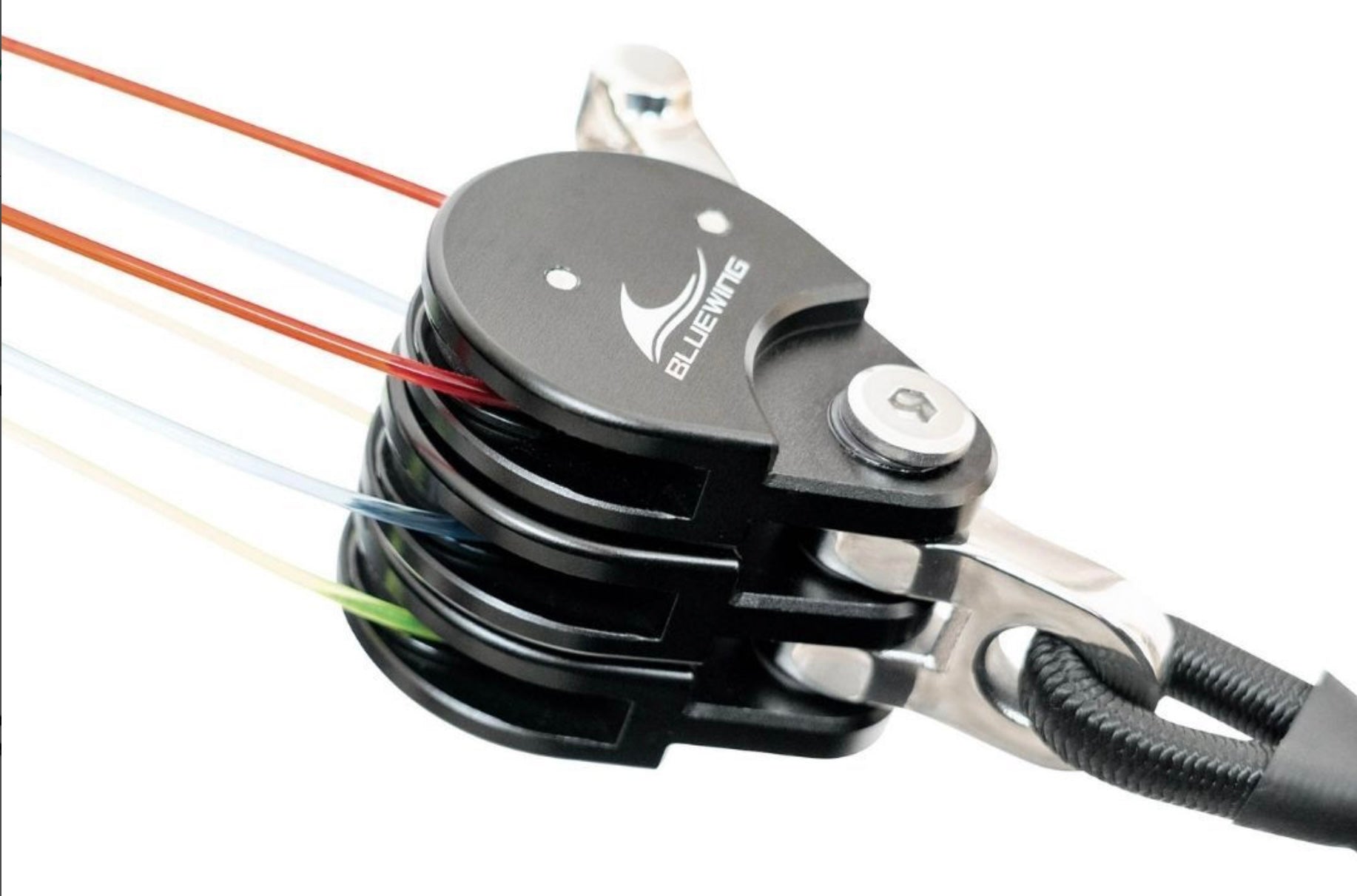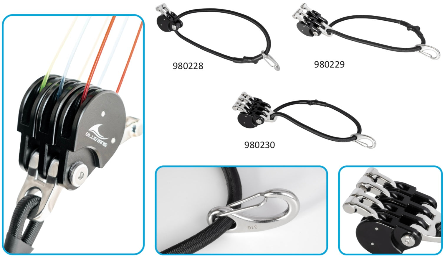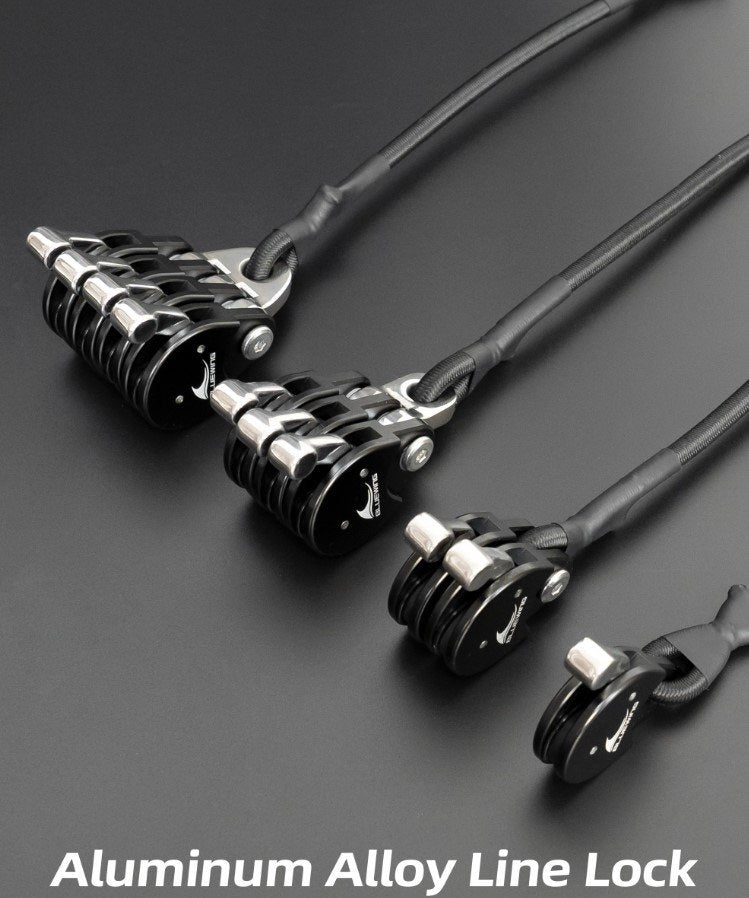 Aluminium anodised body, nylon rope (snubber line), and a stainless-steel looking lever for longevity and durability. Available with either a double, triple or a quad lock block.